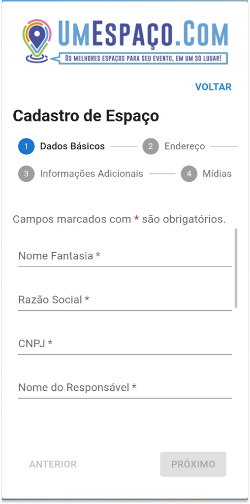 1. DADOS BÁSICOS: Nome fantasia, Razão social, CNPJ, Nome do responsável, E-mail do responsável, WhatsApp do responsável, Descrição sobre seu espaço.